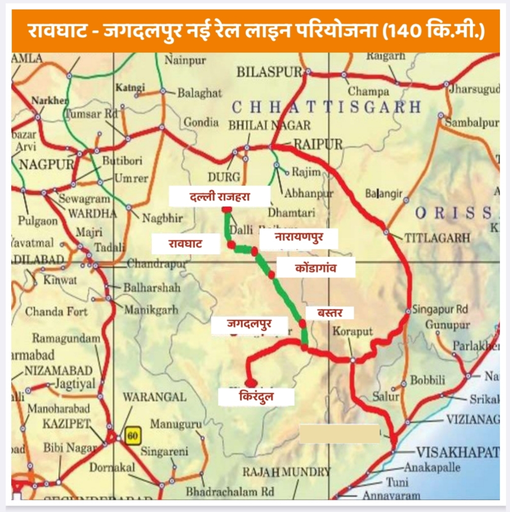 बस्तर के लोगों के लिए खुशखबरी है। भारत सरकार के रेल मंत्रालय ने रावघाट से जगदलपुर तक नई 140 किलोमीटर लंबी रेल लाइन परियोजना को मंजूरी दे दी है। 3513.11 करोड़ रुपये की लागत से बनने वाली इस परियोजना का खर्च केन्द्र सरकार वहन करेगी। इस ऐतिहासिक स्वीकृति पर छत्तीसगढ़ सरकार में वन मंत्री और नारायणपुर विधायक केदार कश्यप ने प्रधानमंत्री नरेंद्र मोदी, रेल मंत्री अश्विनी वैष्णव और मुख्यमंत्री विष्णुदेव साय के प्रति आभार जताया है।
