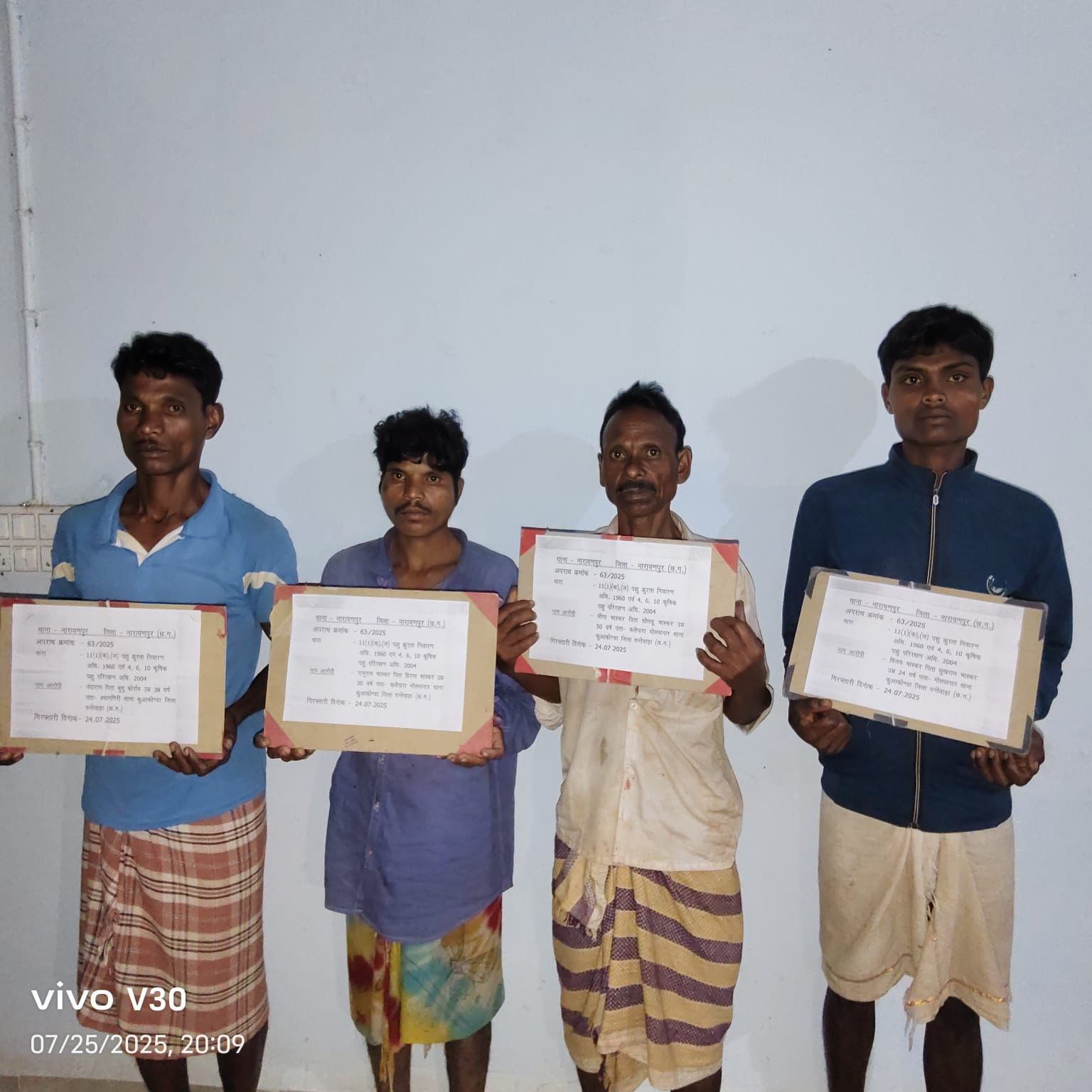 पुलिस ने आरोपियों के खिलाफ पशुओं के प्रति क्रूरता निवारण अधिनियम 1960 की धारा 11(1)(क), 11(1)(ज) तथा छत्तीसगढ़ कृषक पशु परिरक्षण अधिनियम 2004 की धारा 4, 6 और 10 के तहत थाना नारायणपुर में अपराध क्रमांक 63/2025 पंजीबद्ध कर विवेचना शुरू की।