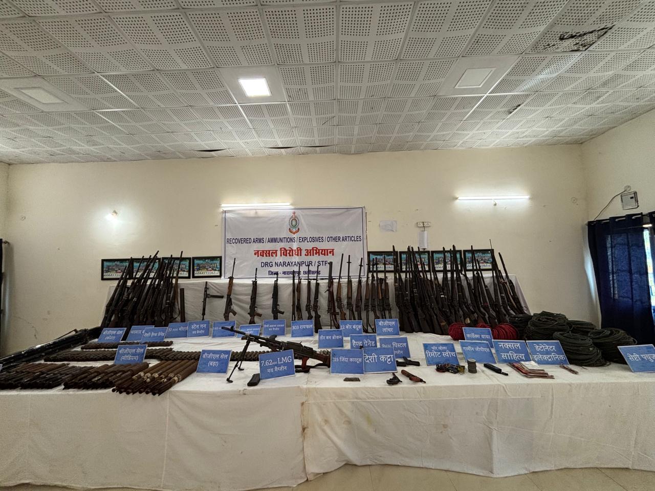 मुठभेड़ के बाद की गई तलाशी में सुरक्षाबलों ने बड़ी मात्रा में अत्याधुनिक हथियार, विस्फोटक सामग्री और नक्सल साहित्य बरामद किया है। बरामद हथियारों में एलएमजी, ट्रिची असॉल्ट रायफल, इंसास, एसएलआर, स्टेनगन, मोटार, पिस्टल, देशी कट्टा, बीजीएल लांचर, 49 भरमार बंदूक, हैंड ग्रेनेड, डेटोनेटर, वायर, जीपीएस उपकरण समेत 300 से अधिक सामग्री शामिल है।