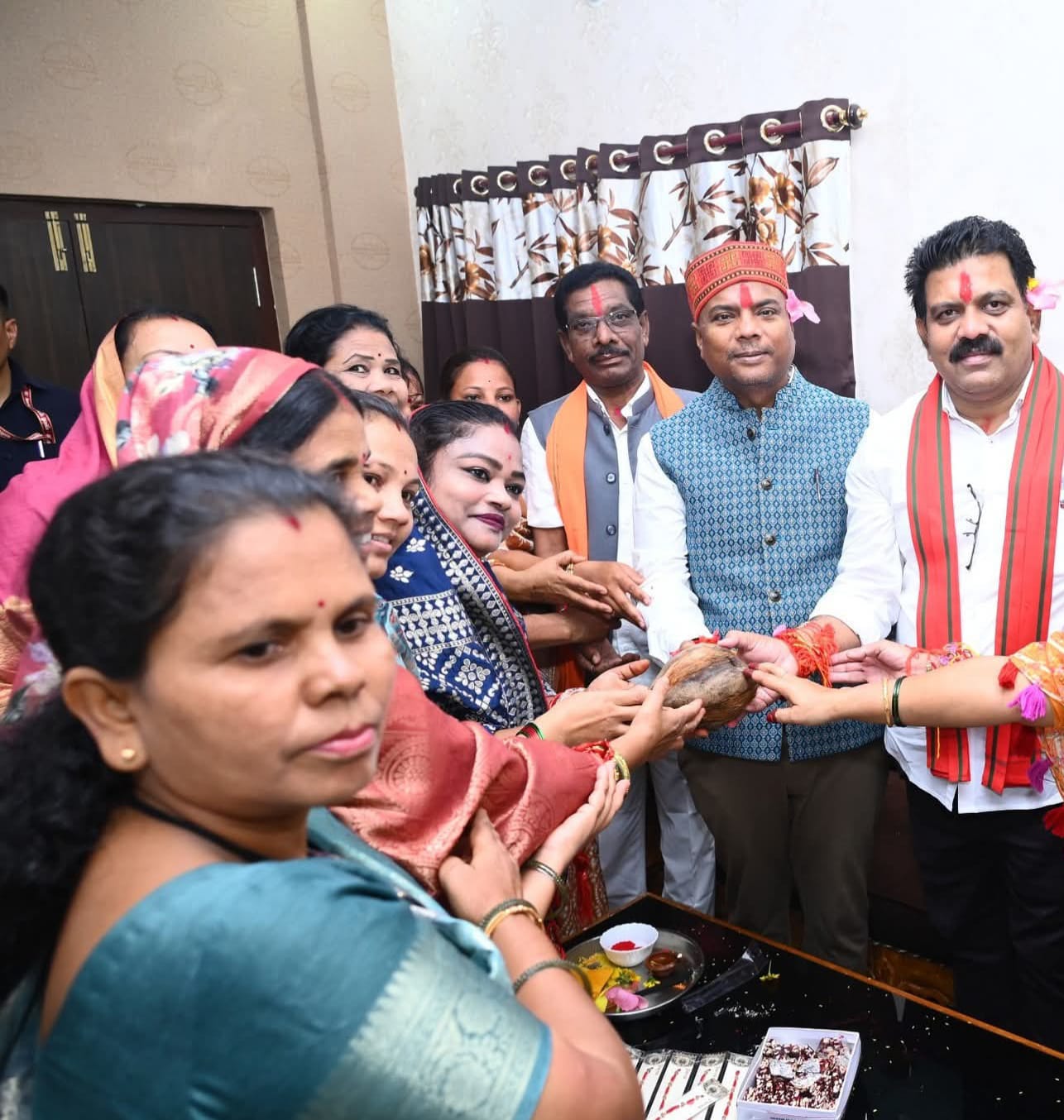 राखी के साथ थाल में अक्षत, रोली और दीप सजाए गए थे। महिलाओं ने परंपरागत विधि से नेताओं को तिलक लगाया, आरती उतारी और फिर रक्षा सूत्र बांधा।