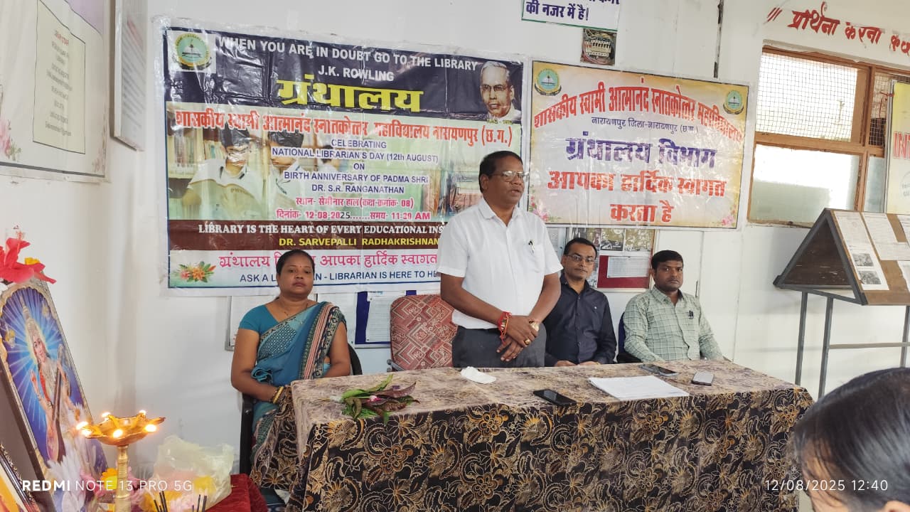 नारायणपुर। शासकीय स्वामी आत्मानंद स्नातकोत्तर महाविद्यालय, नारायणपुर के ग्रंथालय विभाग में सोमवार को भारत में पुस्तकालय विज्ञान के जनक डॉ. एस. आर. रंगनाथन की 133वीं जयंती के अवसर पर साहित्यिक प्रश्नावली प्रतियोगिता का आयोजन किया गया। यह दिवस प्रतिवर्ष 12 अगस्त को नेशनल लाइब्रेरियन्स डे के रूप में देशभर में मनाया जाता है।