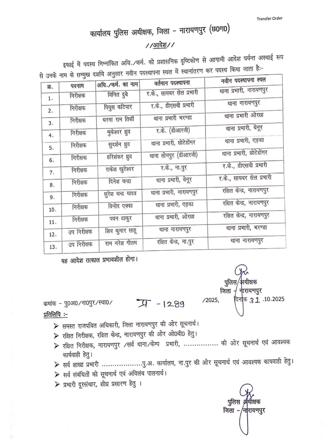 प्राप्त जानकारी के अनुसार, नारायणपुर थाना प्रभारी सुरेंद्र यादव का तबादला किया गया है, उनकी जगह विनीत दुबे को नया थाना प्रभारी नियुक्त किया गया है। वहीं छोटेडोंगर, ओरछा, बेनूर और भरड़ा थानों के प्रभारियों में भी बदलाव किया गया है।