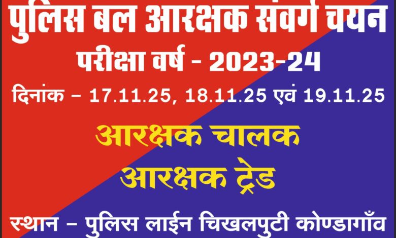 नारायणपुर। पुलिस मुख्यालय अटल नगर, नया रायपुर के आदेशानुसार छत्तीसगढ़ पुलिस बल के आरक्षक संवर्ग चयन परीक्षा 2023-24 के अंतर्गत आरक्षक (चालक) एवं आरक्षक (ट्रेड) के अभ्यर्थियों की ट्रेड परीक्षा आगामी 17, 18 और 19 नवम्बर 2025 को आयोजित की जाएगी। इसके लिए परीक्षा स्थल पुलिस लाइन कोण्डागांव, चिखलपुटी निर्धारित किया गया है।