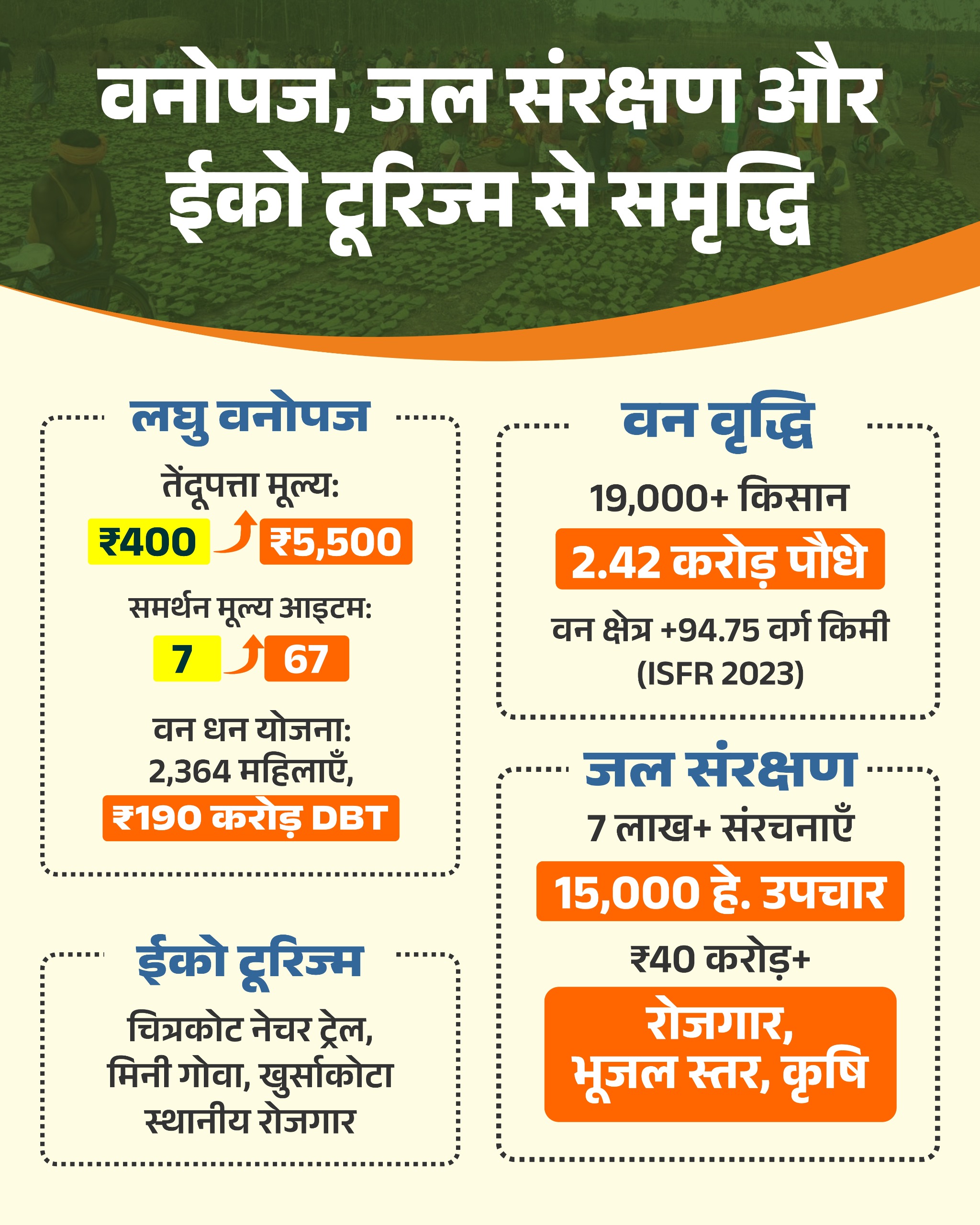 आजीविका के साथ-साथ जल संरक्षण और ईको टूरिज्म ने भी विकास को नई गति दी है। राज्य में नरवा उपचार के तहत 7 लाख से अधिक जल संरक्षण संरचनाओं का निर्माण किया गया है, जिससे लगभग 400 किलोमीटर लंबाई और 15 हजार हेक्टेयर क्षेत्र का उपचार संभव हो सका। इन भू-जल संरक्षण कार्यों ने 40 करोड़ रुपए से अधिक का रोजगार सृजन किया है। इसका सीधा परिणाम भूमिगत जल के स्तर में वृद्धि के रूप में सामने आया है, जिसने कृषि उत्पादन को बढ़ाया है। इस सम्बंध में आईएसएफआर 2023 की रिपोर्ट ने भी इसकी पुष्टि की है, जिसके अनुसार मृदा-नमी में सुधार के कारण वन घनत्व में भी वृद्धि दर्ज की गई है। पर्यटन और हरियाली को बढ़ावा देने के लिए ईको टूरिज्म को रोजगार सृजन का एक महत्वपूर्ण साधन बनाया गया है। विश्व प्रसिद्ध चित्रकोट जलप्रपात के समीप नेचर ट्रेल के निर्माण के साथ-साथ मिनी गोवा और खुर्साकोटा जैसे कई अन्य ईको टूरिज्म स्थलों के विकास की योजना बनाई गई है, जिससे स्थानीय निवासियों के लिए रोजगार की उपलब्धता सुनिश्चित हुई है। इस हरित विकास में किसानों का योगदान भी सराहनीय है। 19,000 से अधिक किसानों ने गैर वन भूमि में लगभग 2 करोड़ 42 लाख पौधों का रोपण किया है। ये सामूहिक प्रयास आईएसएफआर 2023 की रिपोर्ट में परिलक्षित होते हैं, जिसमें छत्तीसगढ़ के वन क्षेत्र में 94.75 वर्ग किलोमीटर की उल्लेखनीय वृद्धि दर्ज की गई है। यह समग्र विकास यात्रा दर्शाती है कि राज्य ने प्रकृति और मानव कल्याण के बीच एक मजबूत संतुलन स्थापित किया है।