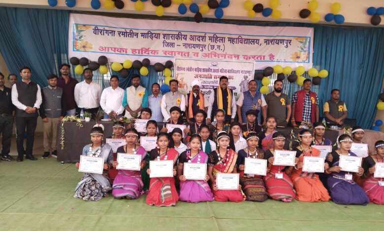 नारायणपुर। वीरांगना रमोतीन माड़िया शासकीय आदर्श महिला महाविद्यालय, नारायणपुर में “जनजातीय समाज का गौरवशाली इतिहास एवं सांस्कृतिक परंपरा” विषय पर आधारित एक दिवसीय विशेष कार्यक्रम गरिमामय व उत्साहपूर्ण वातावरण में आयोजित हुआ। कार्यक्रम का शुभारंभ वीरांगना रामोतीन माड़िया की प्रतिमा पर माल्यार्पण एवं द्विप प्रज्वलन के साथ किया गया। इसके बाद छत्तीसगढ़ राज्य गीत अरपा पैरी के धार का सामूहिक वंदन हुआ।