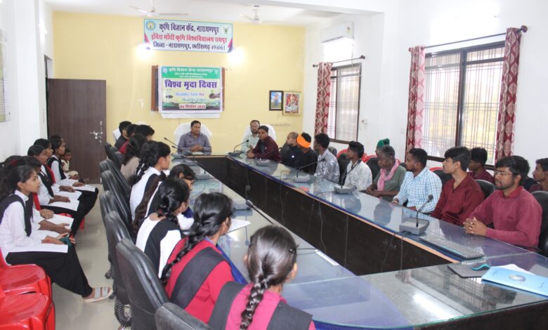 नारायणपुर। कृषि विज्ञान केंद्र नारायणपुर में विश्व मृदा दिवस पर गुरुवार को जागरूकता कार्यक्रम आयोजित किया गया। Healthy Soil for Healthy Cities थीम पर आधारित इस कार्यक्रम में किसानों को मृदा स्वास्थ्य संरक्षण, मिट्टी की उर्वरता बढ़ाने और लागत कम कर अधिक उत्पादन प्राप्त करने के वैज्ञानिक तरीकों की जानकारी दी गई। विशेषज्ञों ने कहा कि नियमित मृदा परीक्षण और संतुलित पोषण प्रबंधन अपनाकर किसान अपनी कृषि उत्पादकता में उल्लेखनीय वृद्धि कर सकते हैं।