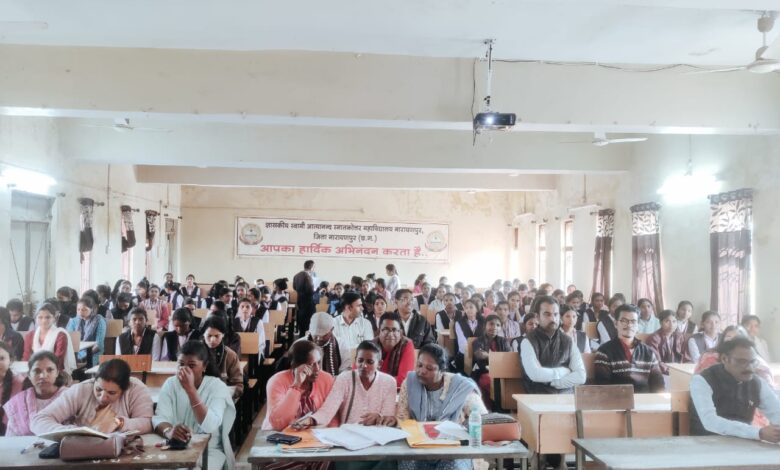 शासकीय स्वामी आत्मानंद स्नातकोत्तर महाविद्यालय में आयोजित कार्यशाला के दौरान उपस्थित छात्र-छात्राएं एवं अधिकारी, मंच से महिलाओं के यौन उत्पीड़न निवारण अधिनियम–2013 पर जानकारी देते वक्ता।
