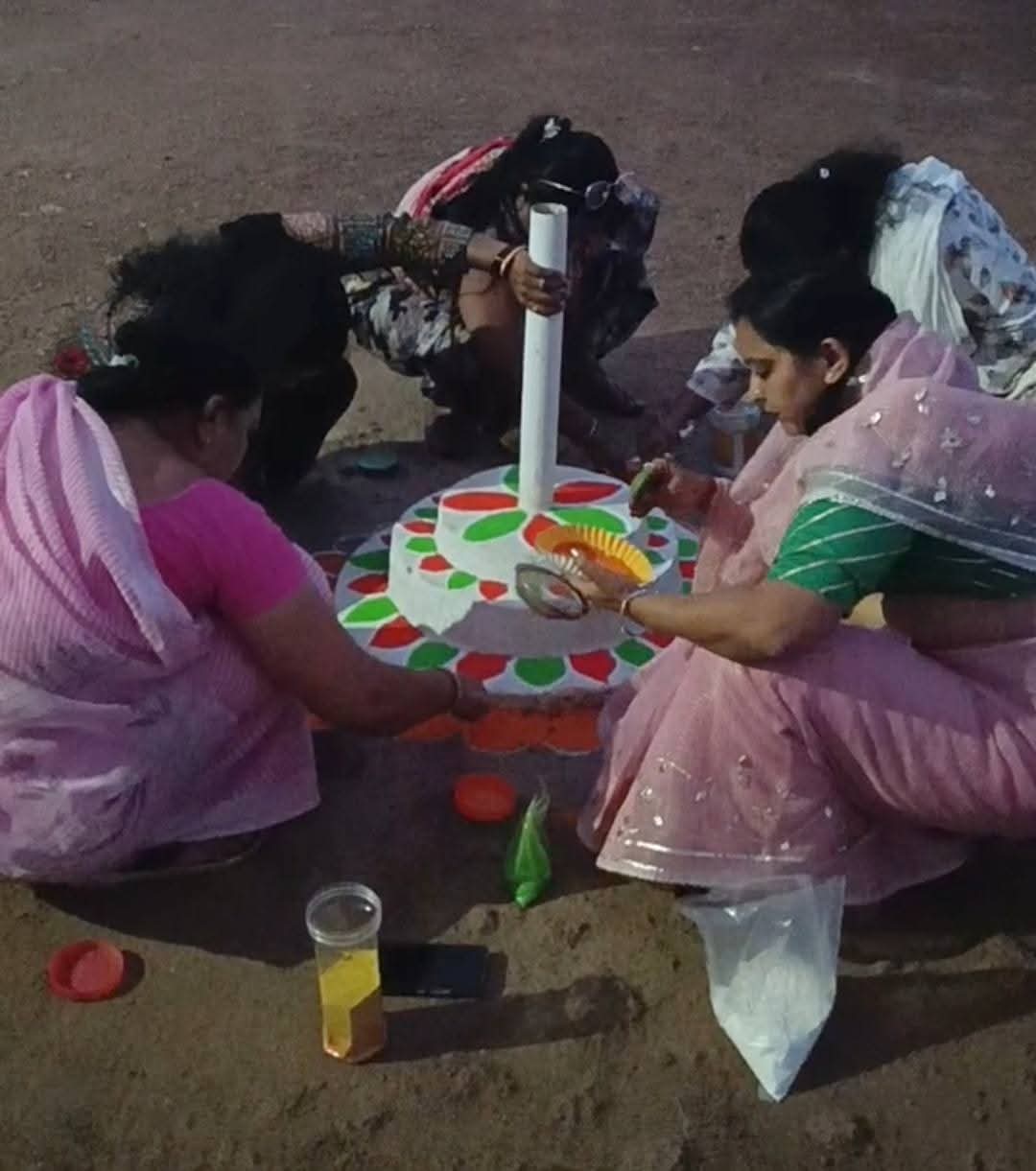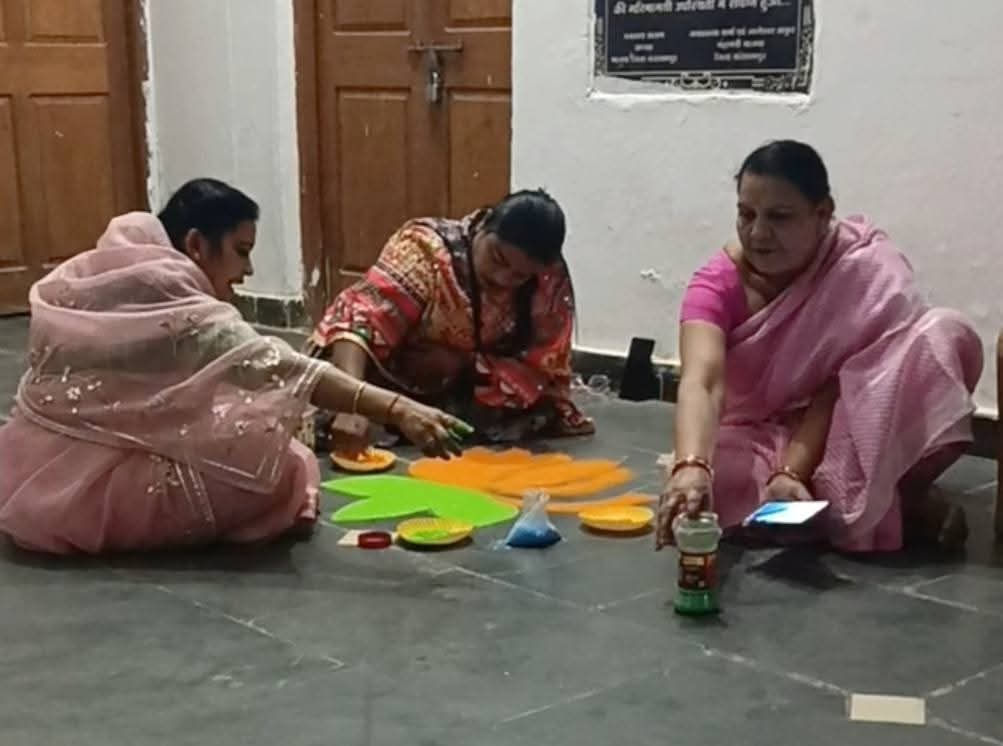 महिला कार्यकर्ताओं ने अपने हाथों से घंटों मेहनत कर इस रंगोली को आकार दिया। तस्वीरों में साफ दिखता है कि किस तरह वे जमीन पर बैठकर एक-एक रंग को सहेजते हुए उसे सजीव बना रही थीं।
