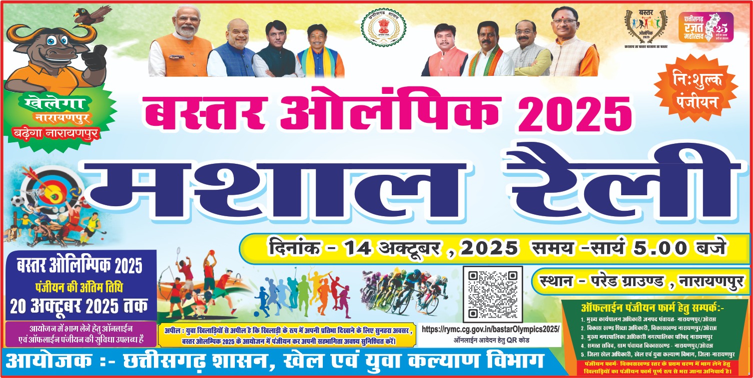 पारंपरिक खेलों को बढ़ावा देने के उद्देश्य से आयोजित बस्तर ओलंपिक 2025 के तहत 14 अक्टूबर को शाम 5 बजे परेड ग्राउंड, नारायणपुर से मशाल रैली निकलेगी। इसमें जनप्रतिनिधि, अधिकारी, विद्यार्थी और खिलाड़ी भाग लेंगे। प्रतियोगिताओं के लिए 20 अक्टूबर तक ऑनलाइन पंजीकरण किया जा सकता है।
